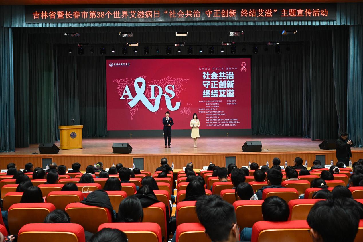 11月28日,吉林外国语大学内暖意融融、爱意涌动,吉林省暨长春市第38个“世界艾滋病日”主题宣传活动在此举行。本次活动由吉林省疾病预防控制局、吉林省教育厅、长春市卫生健康委、长春市教育局等单位主办,吉林省疾病预防控制中心、吉林省艾滋病性病防治协会、吉林省预防医学会、长春市疾病预防控制中心(长春卫生监督所)等指导单位参与,吉林外国语大学承办。本次活动紧扣“社会共治守正创新终结艾滋”主题,汇聚多方力量,共同传递防艾信念、普及防艾知识、凝聚共治合力。省疾病预防控制局副局长王驰、省教育厅二级巡视员包国庆、长春市卫生健康委副主任吴静、长春市教育局体卫艺处副处长张贤春,吉林外国语大学党委副书记苗晶以及吉林省、长春市、净月区疾病机构相关领导出席本次活动。