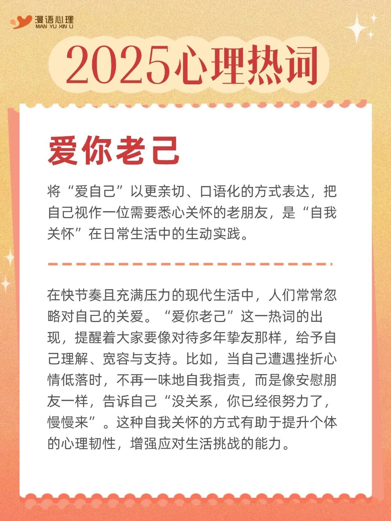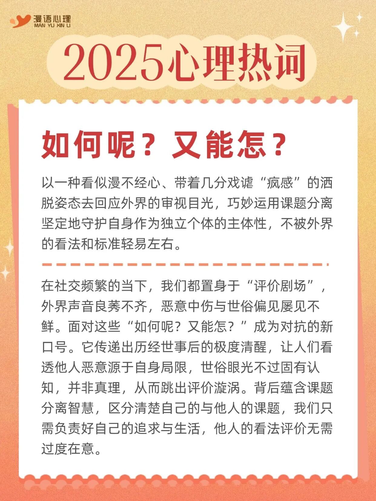 2025年心理热词来啦!在这个社交频繁的时代,我们常常陷入外界评价的漩涡,“如何呢?又能怎?”运用课题分离的智慧,坚定守护自己的主体性,不被他人看法左右。