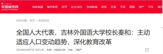 3月7日,中国城市网、民进网、吉林日报、“吉林发布”公众号等媒体平台报道了全国人大代表秦和校长的两会建议。